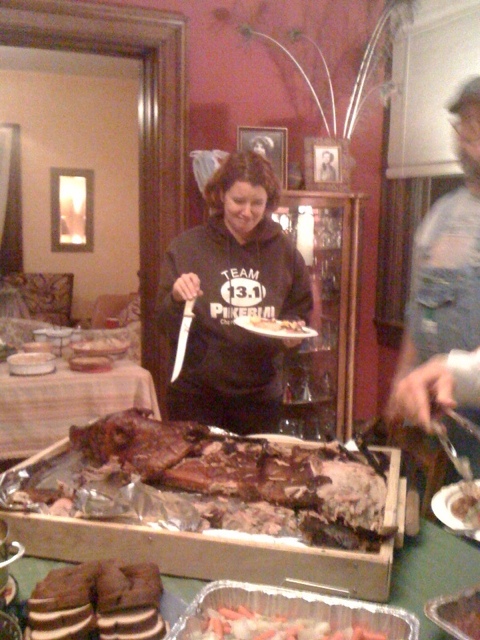 We went to a pig roast last night hosted by my sister’s next door neighbor. We watched the pig roast all day. Gracie was particularly enthused by the goings-on next door. As a lapsed vegetarian and am avowed cutitarian, I was horrified by the concept of eating something that still had a face.