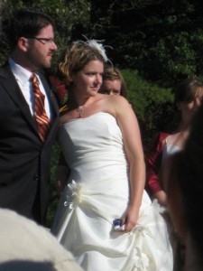 I figured these issues cancelled each other out at least somewhat, so we delayed the ceremony for a few minutes while my brother-in-law, Luke, went off in search of my iPod. He couldn’t find it, so he brought back my iPhone and I performed the traditional “purchasing of the ceremony music from iTunes whilst hiding in the woods from all of the wedding guests.” I wish that there was a picture of this moment. I’m told that it looked pretty funny.
