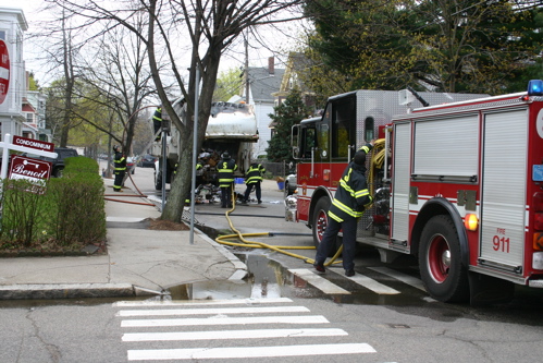 On Tuesday, when I was walking to work, I saw a garbage truck on fire. The top was all charred and it was smoldering. Then some of the garbage in the back burst into flames. It was pretty amazing, actually. I took a picture, here it is (click on it for huge honking full-size image fun):