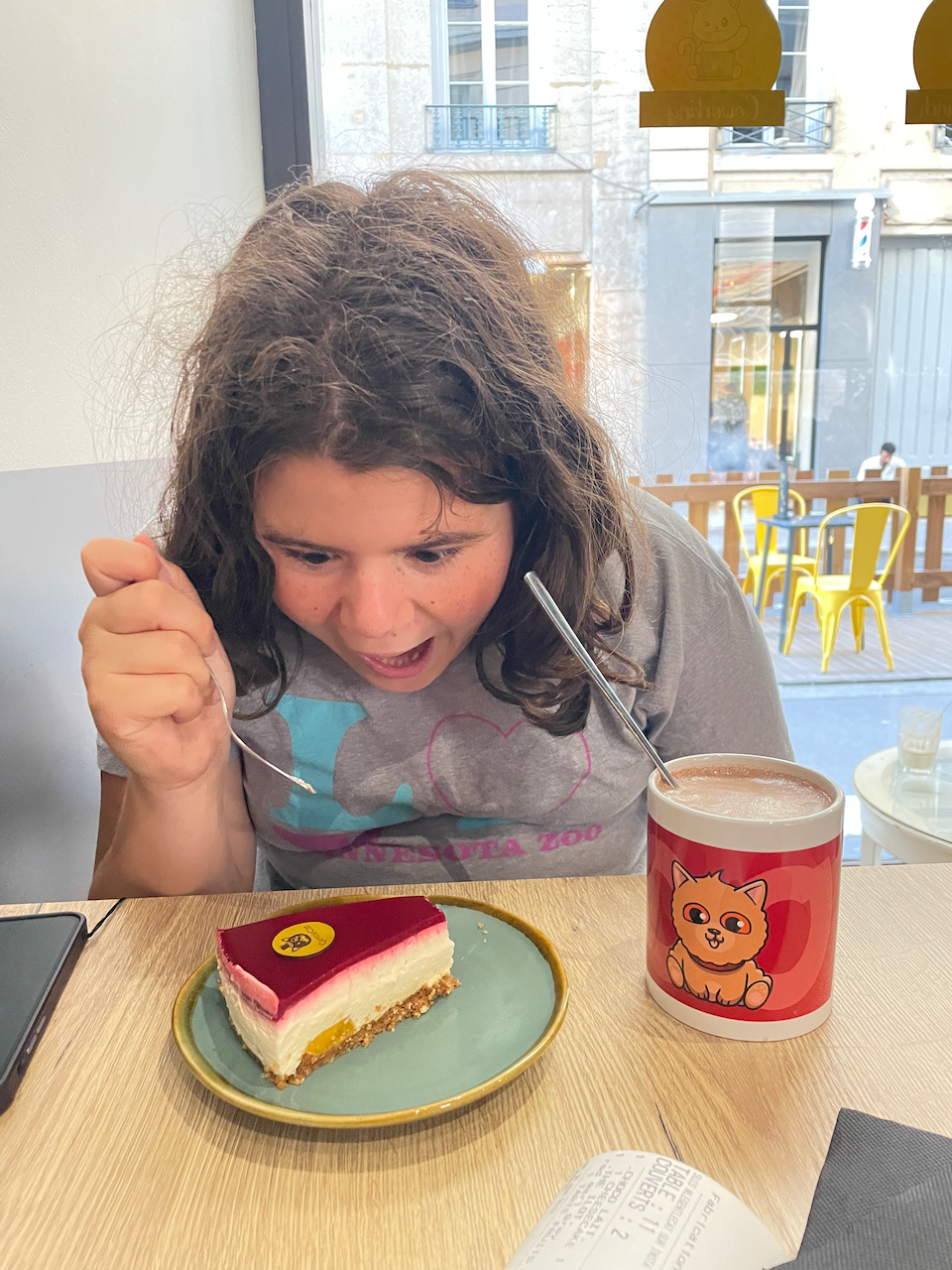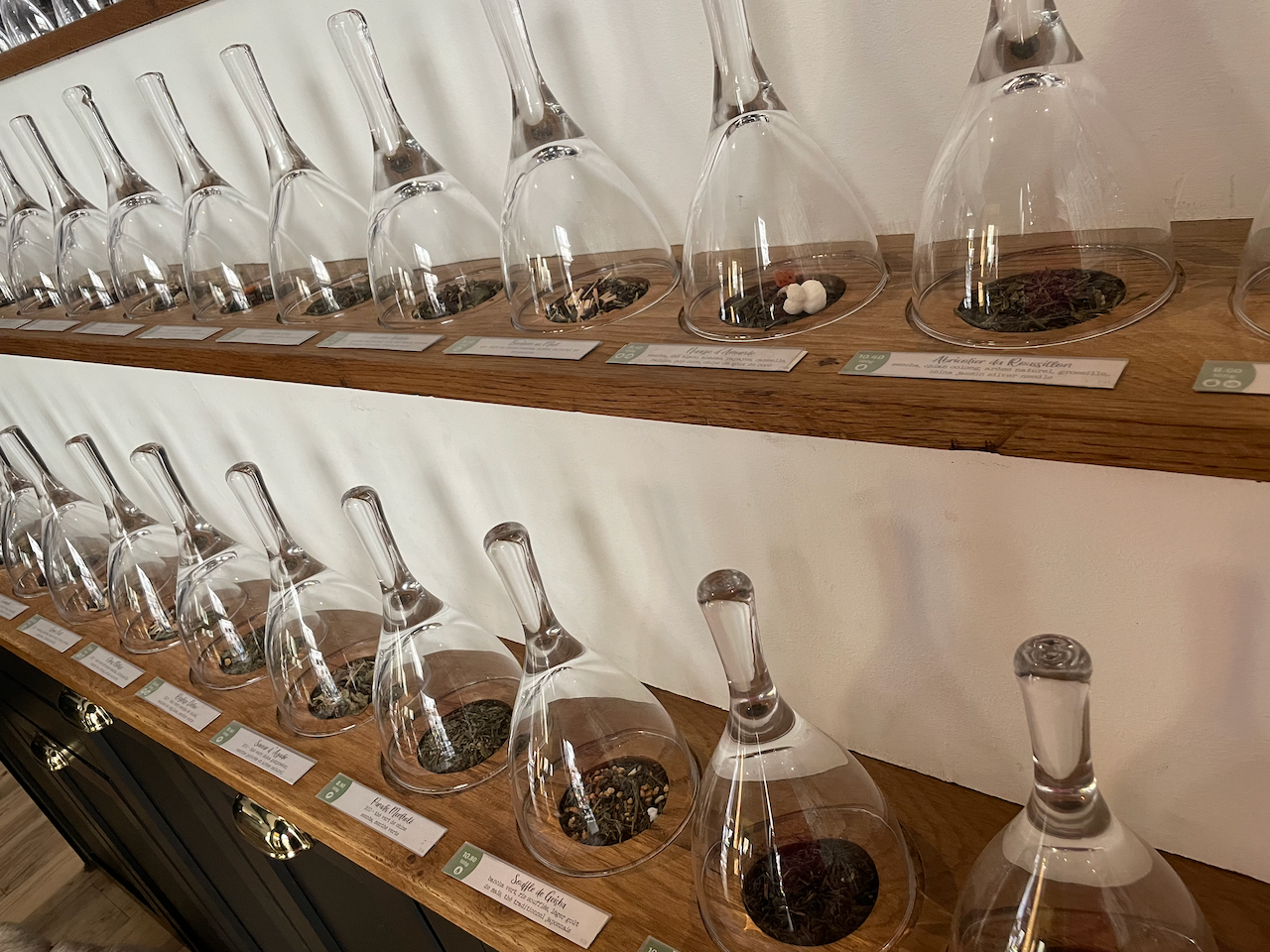 This café also had tea samples under cloches, so I was able to get a photo (we were in tourist mode, after all). I am now ruined for all other tea shops. Also, the French have fantastic tea options. Lilian wasn’t into any of them, however, so they got a hot chocolate.