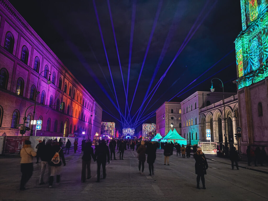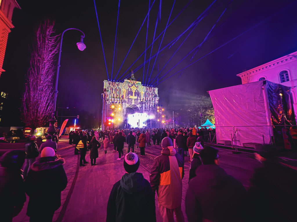 The plaza was all decked out with lighting installations. They’d projection mapped the buildings, and there were lasers shooting up from the stages.